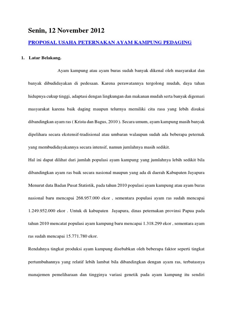 Contoh proposal ternak ayam word. Demikian proposal ini kami ajukan semoga dapat memberikan gambaran yang jelas tentang usaha peternakan ayam kampung pedaging ini. Proposal permohonan bantuan budidaya ayam kampung. Melalui surat penawaran ini kami menawarkan proposal penjualan ternak ayam pada bapak ibu untuk memenuhi kebutuhan bapak ibu dalam hal penyediaan ayam pejantan untuk sarana upakara.