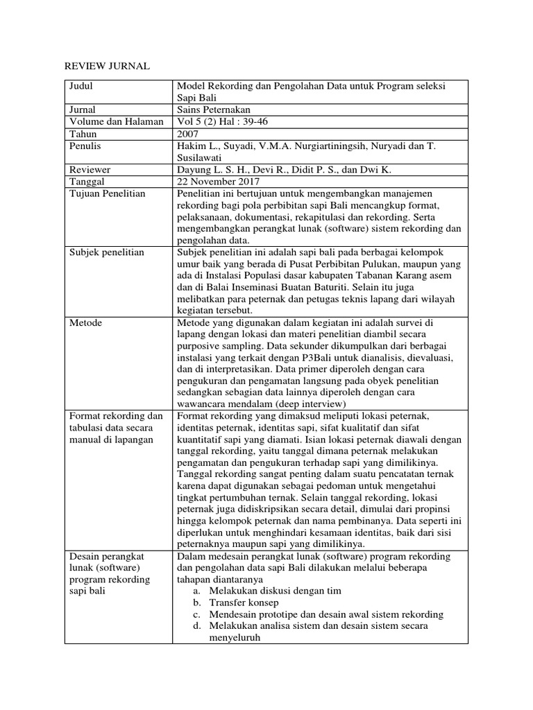 Contoh review jurnal peternakan. Jurnal yang berjudul Pemanfaatan Feses Ternak Sapi Sebagai Energi alternatif Biogas Bagi Rumah Tangga Dan Dampaknya Terhadap Lingkungan yang ditulis oleh Latifah Hanum Damanik dari STIKES Surya Global Yogyakarta Adi Heru Husodo dari Fakultas Kedokteran Universitas Gadjah Mada dan Totok Gunawan dari Fakultas Geografi Universitas Gadjah Mada iniberisi tentang pemanfaatan feses ternak. Bagi Anda yang berkutat di dunia akademisi atau penelitian pastinya anda sudah tidak asing lagi dengan istilah jurnal atau review jurnal baik jurnal internasional yang dibuat oleh reviewer berpengalaman atau pun jurnal Indonesia pada. Review Berdasarkan kedua jurnal tersebut maka dapat diketahui bahwa beberapa faktor dapat mempengaruhi kecernaan BK dan BO pakan.