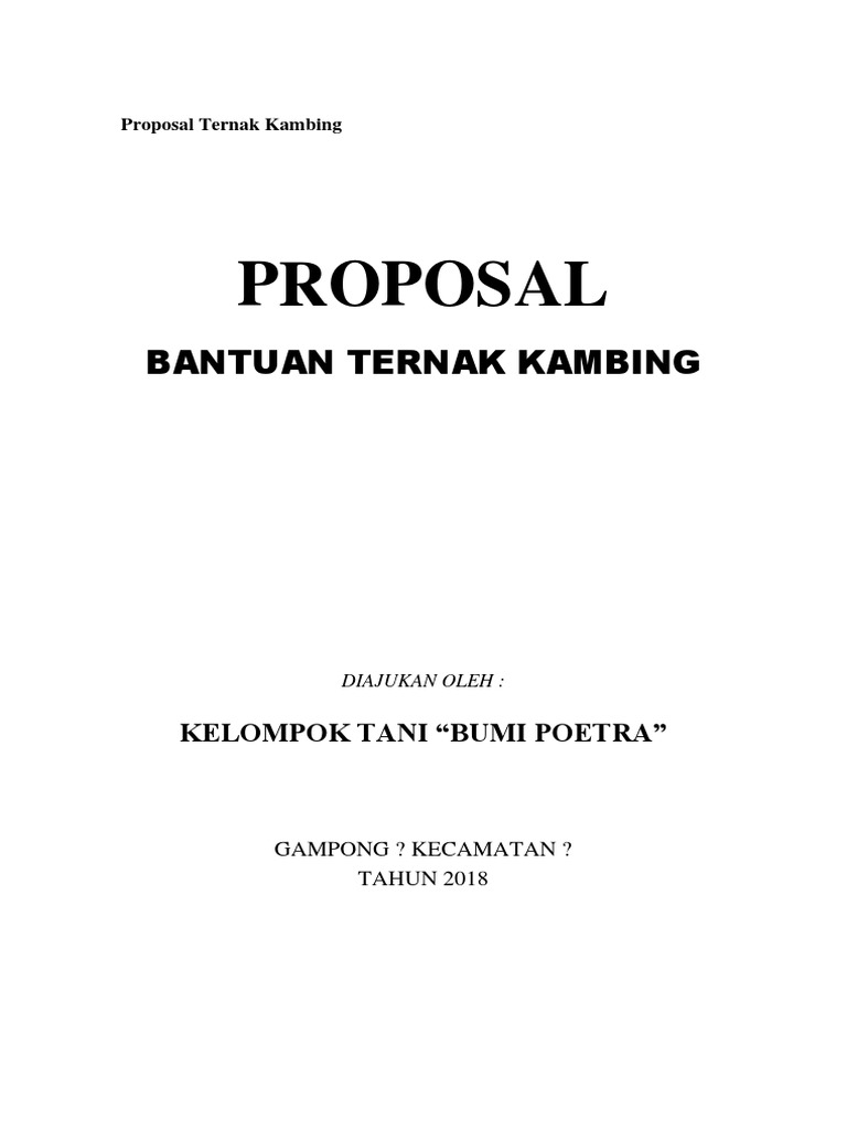 Proposal Permohonan Bantuan Ternak Kambing. Bobot badan kambing PE jantan dewasa dapat mencapai 65-90 kg dan kambing betina 45-70 kg. Demikian proposal ini disusun untuk melengkapi permohonan bantuan modal usaha untuk kegiatan budidaya peternkan kambing.
